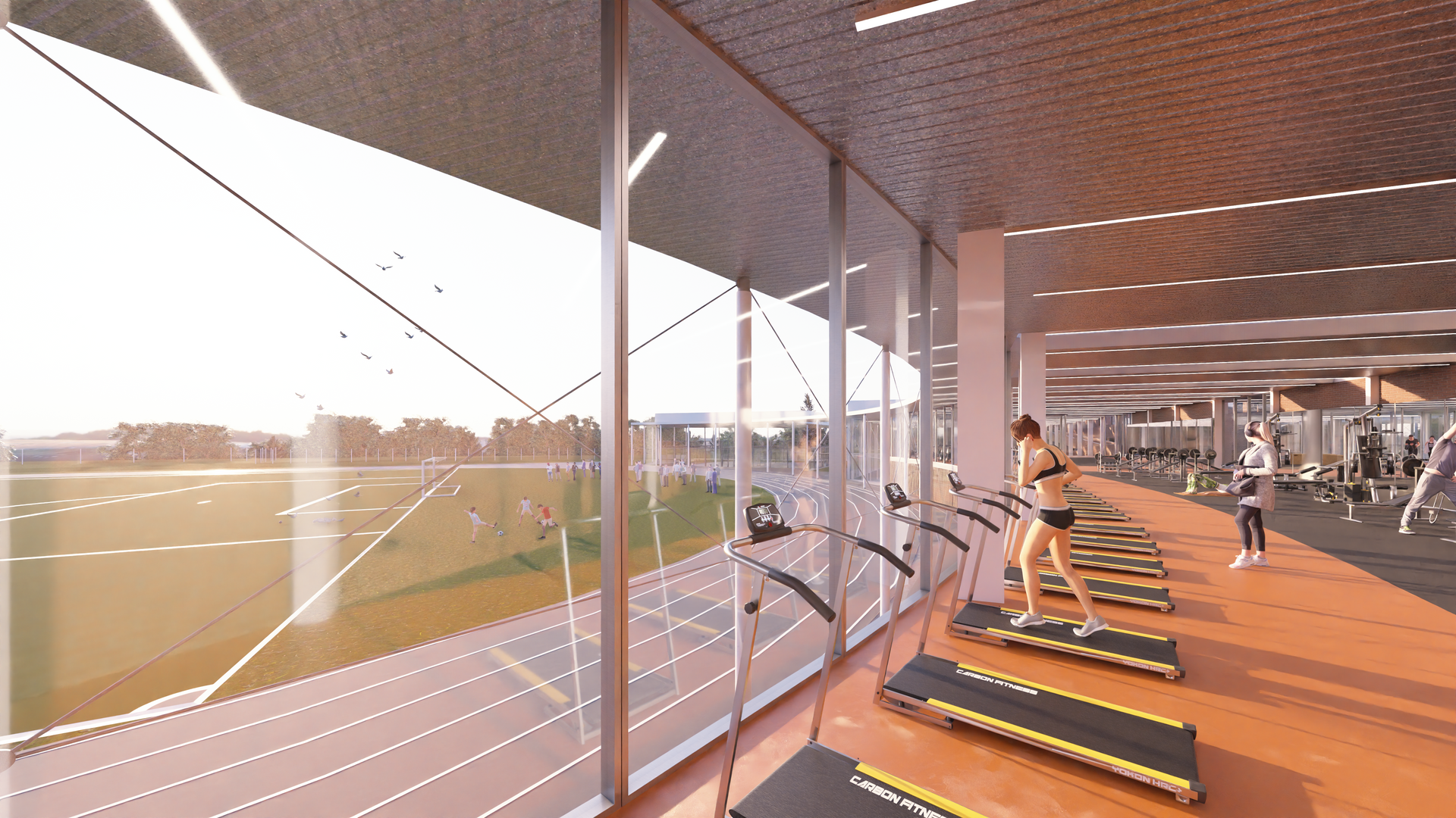 En la ampliación se distinguen 3 volúmenes con un carácter compacto, que alojan los nuevos espacios deportivos interiores, destinados a cancha polideportiva, gimnasios, y rocódromo. Estos volúmenes cuyas geometrías se adaptan al orden establecido por el edificio existente, así como al paseo del río y de la pista de atletismo, se unen por la presencia de una gran cubierta integradora, que acoge a su vez los espacios exteriores deportivos (calentamiento para atletas y dos pistas de pádel) y de acceso de equipos al complejo (diferenciados del acceso ppal.).